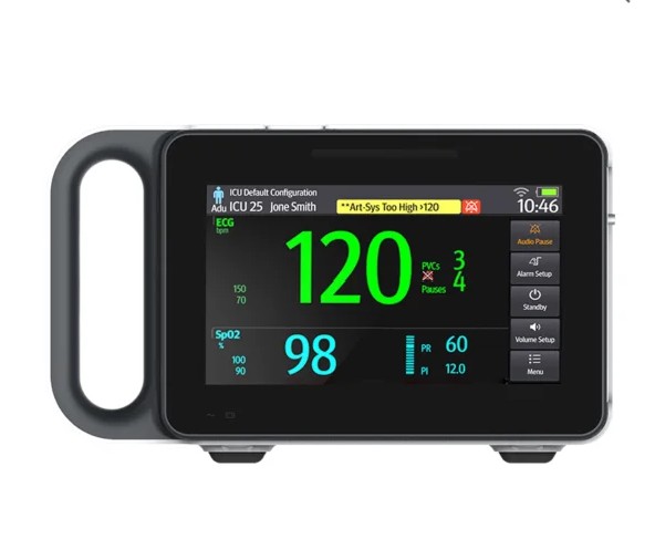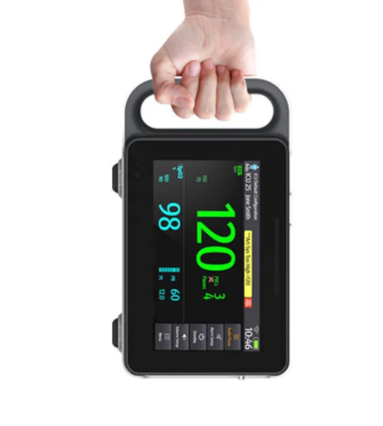 Monitor multiparámetros portátil, con pantalla LCD de 7″ y peso de 950gr. Cuenta con batería incorporada de 4 horas y permite visualización de parámetros como ECG 3, FC, FR, SpO2, FP, Temperatura, CO2.